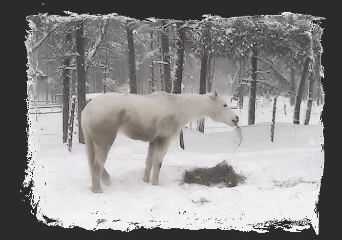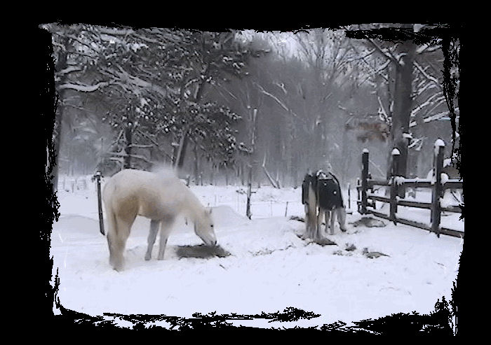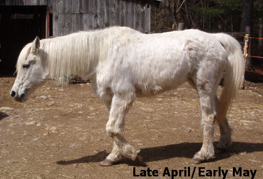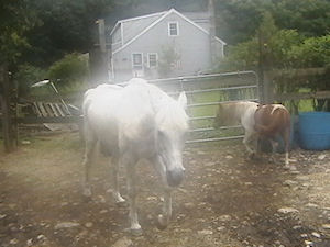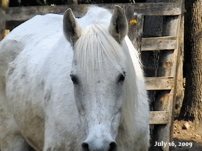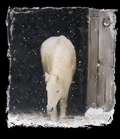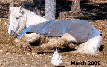 UPDATE DECEMBER 10, 2009 No photos cause Misty is a MESS! Being allowed to come and go as she pleases, in and out, she pleases to roll in the mud frequently. It's just too cold to bathe her so she gets brushed out somewhat and then goes on her merry way. While she had a few weeks when the cold weather was coming in that really bothered her lymphangitis she seems to have leveled off and is now getting around well. She's bright and alert and happy. Her weight has maintained and her appetite is excellent. Her coat is long and silky - not at all wiry and stiff as in former years. Her mane and tail have grown tremendously this past year and continues to do so. Her hooves are in good condition (although being the 'cobbler's kid' she's a bit overdue for a trim.) and strong. No issues due to excess mud and water this past season. As a side note, Misty is no longer under Lisa St. John's care but will continue on her diet as all the critters here are now on (Ponies have gotten so tubby they had to be cut back on their allotments!) -- even Dorian, my senior TB is gaining weight and becoming more energized. For him, gaining weight in cold weath is a total enigma!) So all is well at Penzance this Christmas season. Well, manure stains and all - had to post these from today, Dec. 20th - BLIZZARD 09!