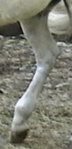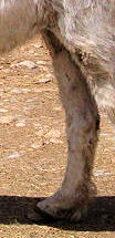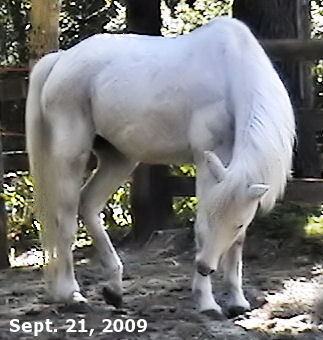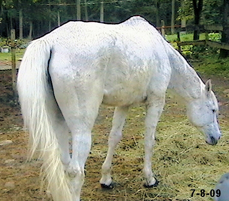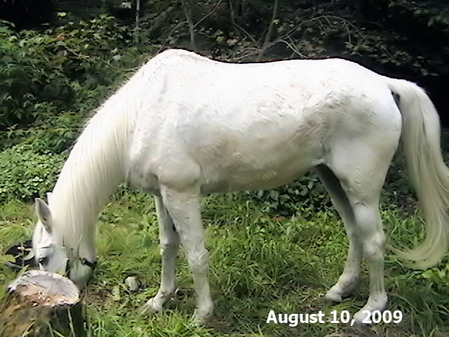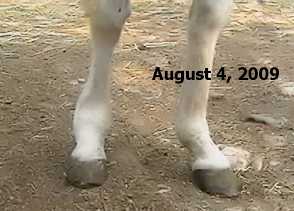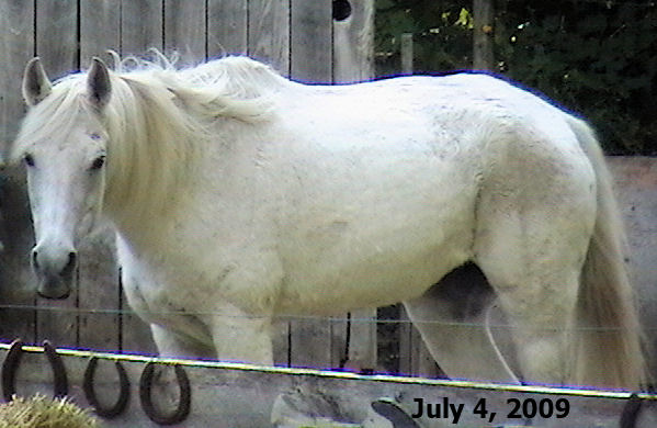 MISTY July 4, 2009 Quick history - When our "Bub" passed on 3 years ago his paddock mate, Misty went into a deep depression. Along with this depression her IR became accompanied by full-fledged Cushings and as of this spring was Dx'd as 'late stage'. We were steeling ourselves and resigning to having her humanely euthanized before this winter (2009/2010) set in as we didn't think she'd make it through. She also got Lymphangitis 1 1/2 yrs. ago (was it really that long ago?) and her RR pastern has never been the same since. It 'froze' and she's not been able to flex it since the initial insult. The leg swelling had gone down (she had stove-piped big time!) but her pastern was still the size of a large grapefruit and she was very sensitive on it. (I am adding updated photos regularly - please be sure to refresh your browser with each viewing.) And here's a photo (below) I took of her today, July 4, 2009, just about 3 weeks after going on her LavenderSage Nutrition Management Program© (although she hasn't even started her herbs yet!):